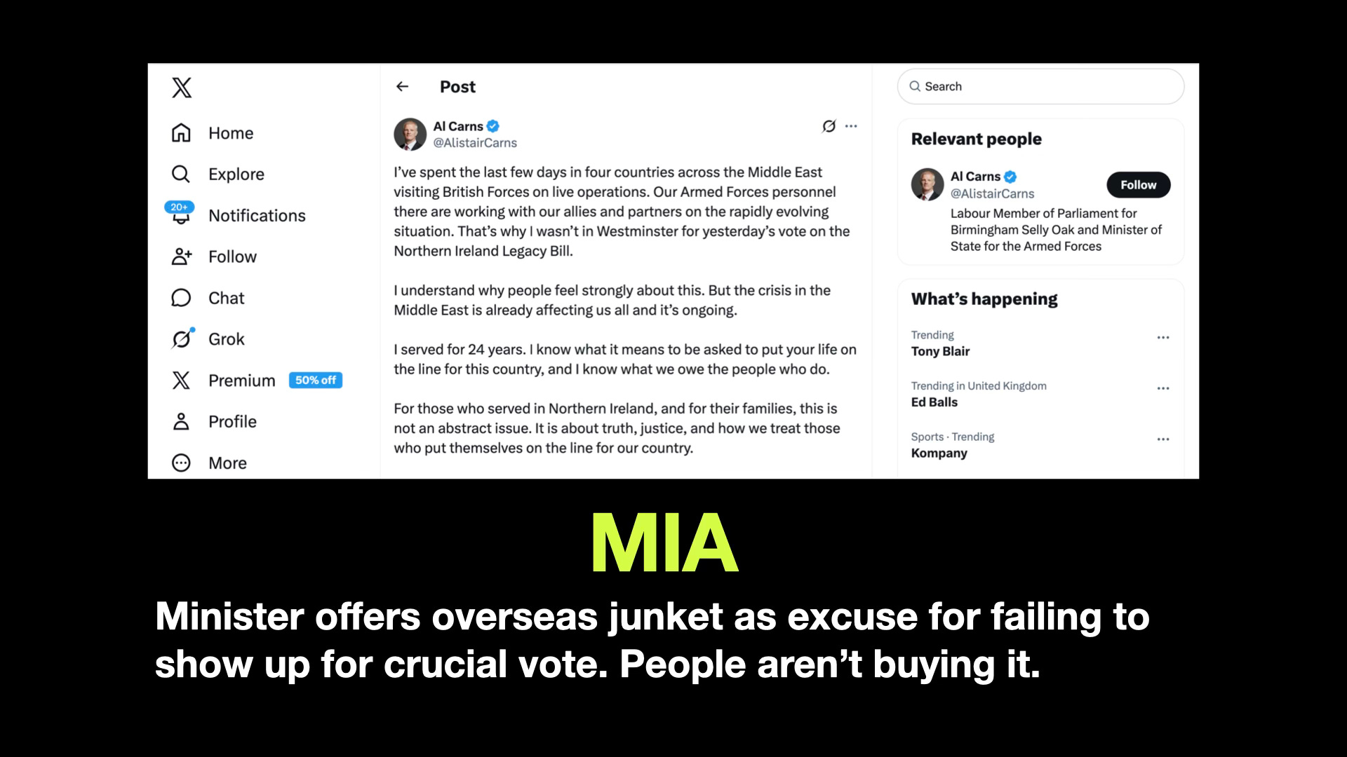 A missed vote on Trouble Bill triggered a surge of hostile reaction online, with veterans questioning where Alistair Carns truly stands. The response is not about procedure, but about trust.