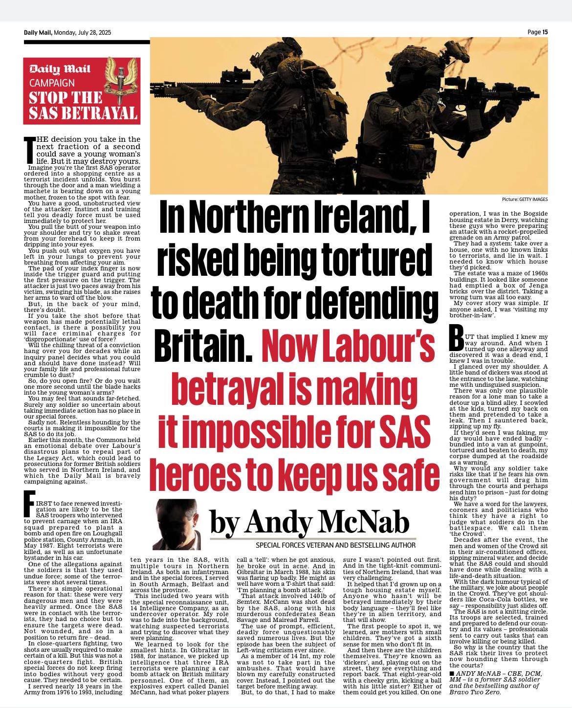 Andy McNab, Special Forces veteran and author, writes for the Daily Mail (28/7/25) a compelling piece about his experience, headlined: “In Northern Ireland, I risked being tortured to death for defending Britain. Now Labour’s betrayal is making it impossible for SAS heroes to keep us safe.”