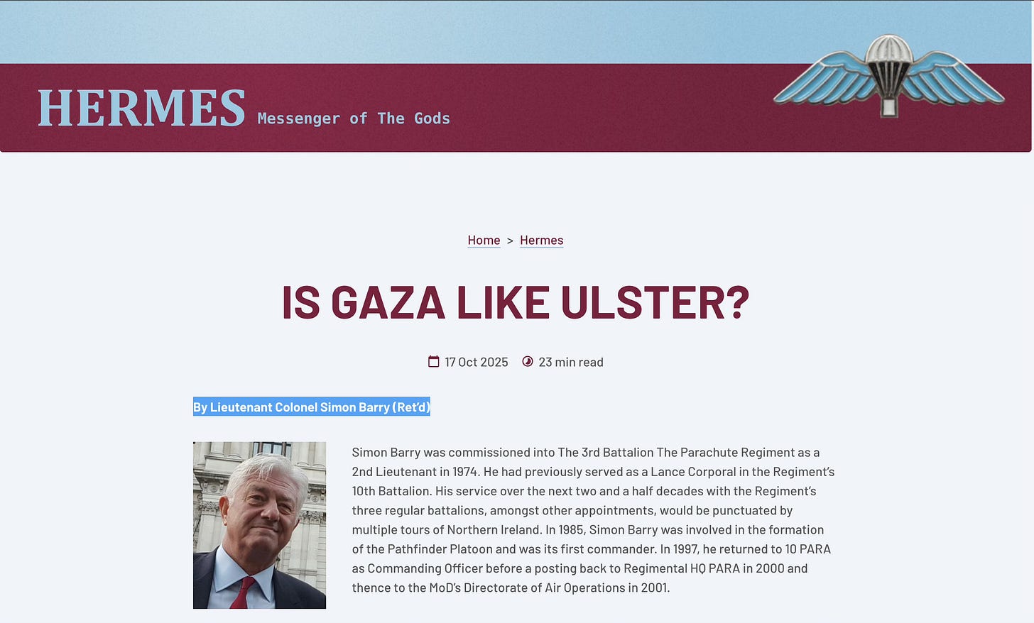 Lieutenant Colonel Simon Barry (Ret’d) offers a critical analysis in Hermes magazine that challenges simple comparisons between Ulster and Gaza. He highlights the unique historical, political, and cultural factors that influence each conflict and its possible resolutions.