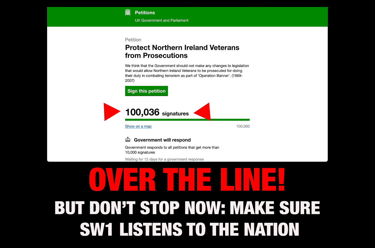 They are saying, the Government should not make any changes to legislation that would allow Northern Ireland Veterans to be prosecuted for doing their duty in combating terrorism as part of 'Operation Banner'. (1969-2007).