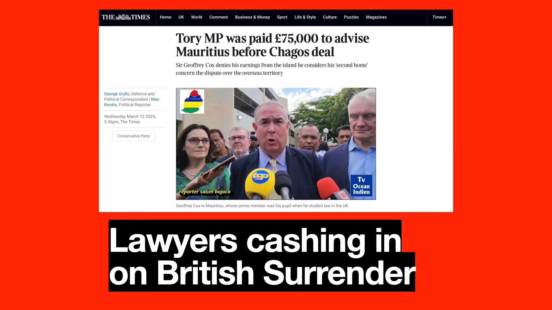 The Times (13/3/25) revealed that Tory MP Sir Geoffrey Cox received £75,000 for advising the Mauritian government onthe Chagos Islands during a key period before a significant deal.